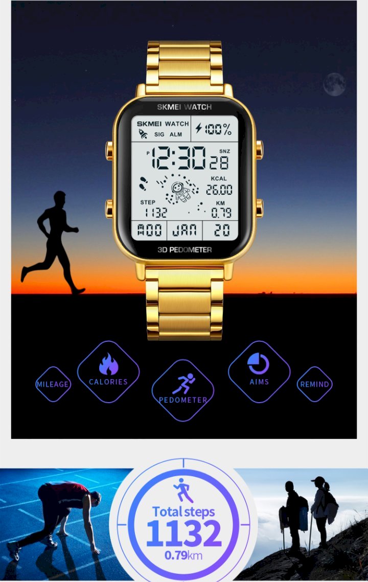 2Time ,3D Pedometer,Mileage, Calories, Stopwatch,Alarms, Data storage, Week,Date, EL Light, 12/24 hour clock |